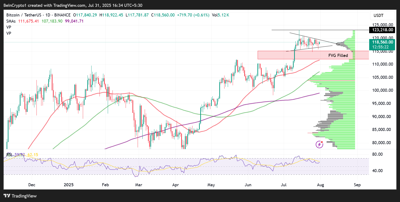 ブルが優勢になれば、ビットコインはペナントの上限を突破する可能性がある。12万ドルを超える決定的なローソク足のクローズがあれば、BTCは過去最高値(ATH)である12万3,218ドルを取り戻す可能性。