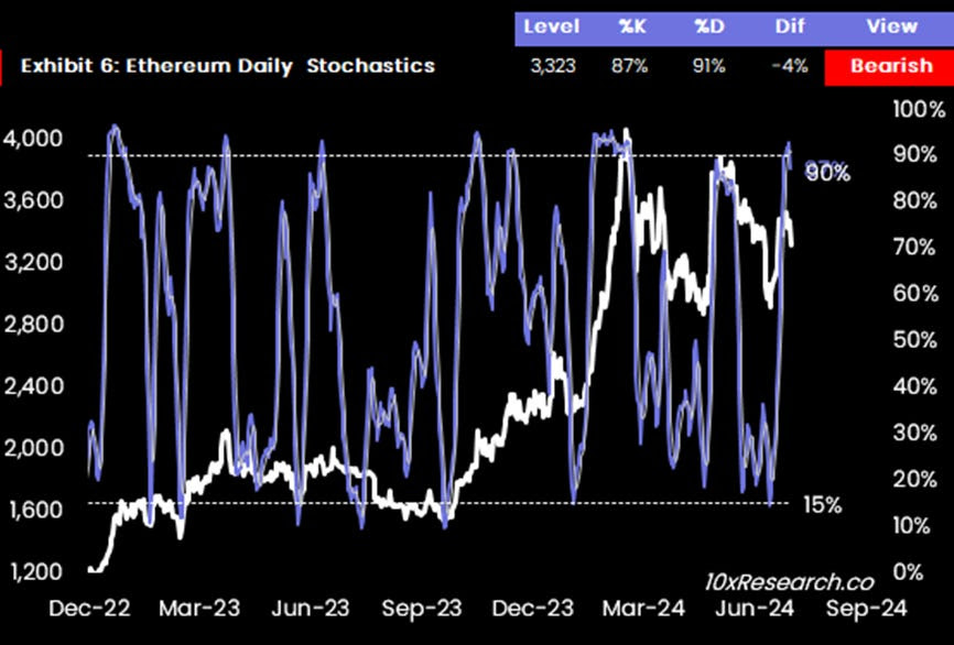 「火曜日に示したように、ストキャスティクス指標はレンジの頂点にあり、トップが形成される可能性を示唆している。ストキャスティクスの数値が90%を超えると調整局面となることが多く、15%を下回ると安値買いとなる。イーサリアムの現在の数値は87%(92%から)であり、イーサリアムはより低い水準に向かっているように見える。