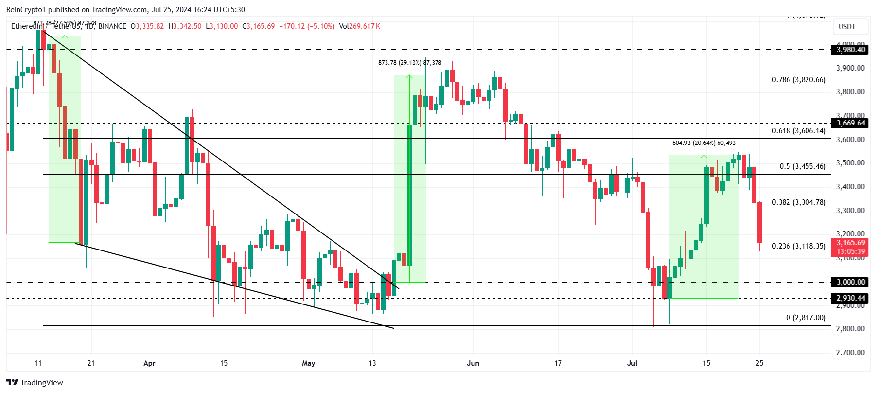 イーサリアム価格は現在、3,118ドルでマークされたフィボナッチリトレースメント23.6%ラインを上回っている。前述したような激しい状況が続けば、ETHは3,000ドルのドローダウンを視野に入れる可能性がある。