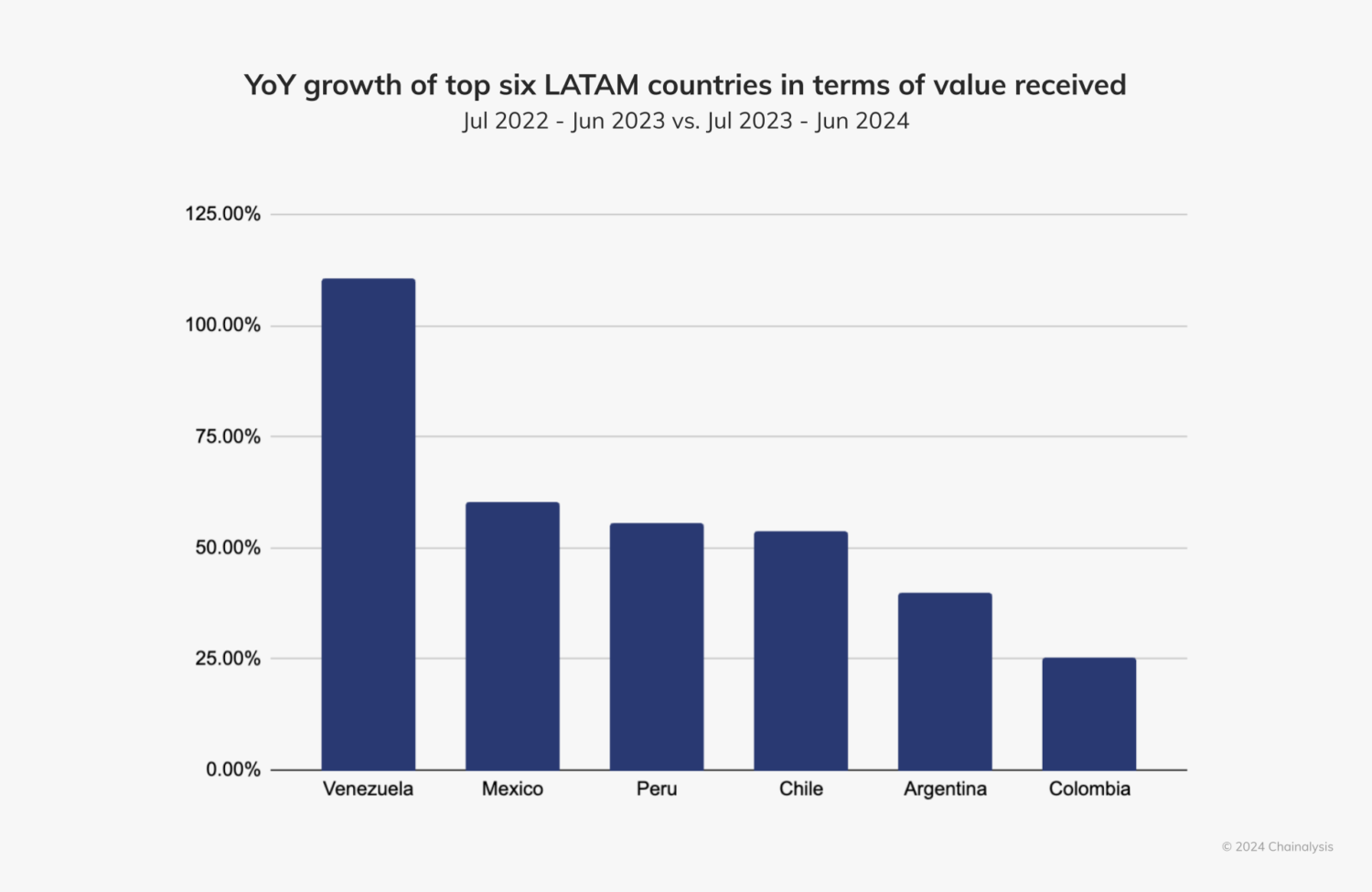 “マドゥロ政権は最近、具体的な計画を示さずに暗号資産への関心を新たに示唆しました。このような政治的動静の結果に関わらず、ベネズエラはラテンアメリカで最も急速に成長している暗号資産市場の一つです。ベネズエラの年間成長率は110%に達し、この地域の他の国々を大きく上回っています。”とChainalysisは指摘しています。