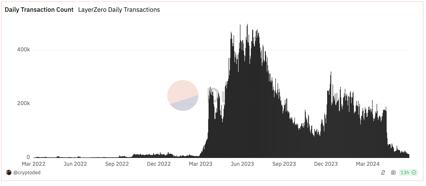 論争の中、オンチェーンメトリクスはLayerZeroエコシステムの弱気なセンチメントを示唆している。Duneの分析データによると、1日の取引件数は90%以上減少している。このピークレベルからの反発は、エアドロップ農家が逃げ出すことで生じている。