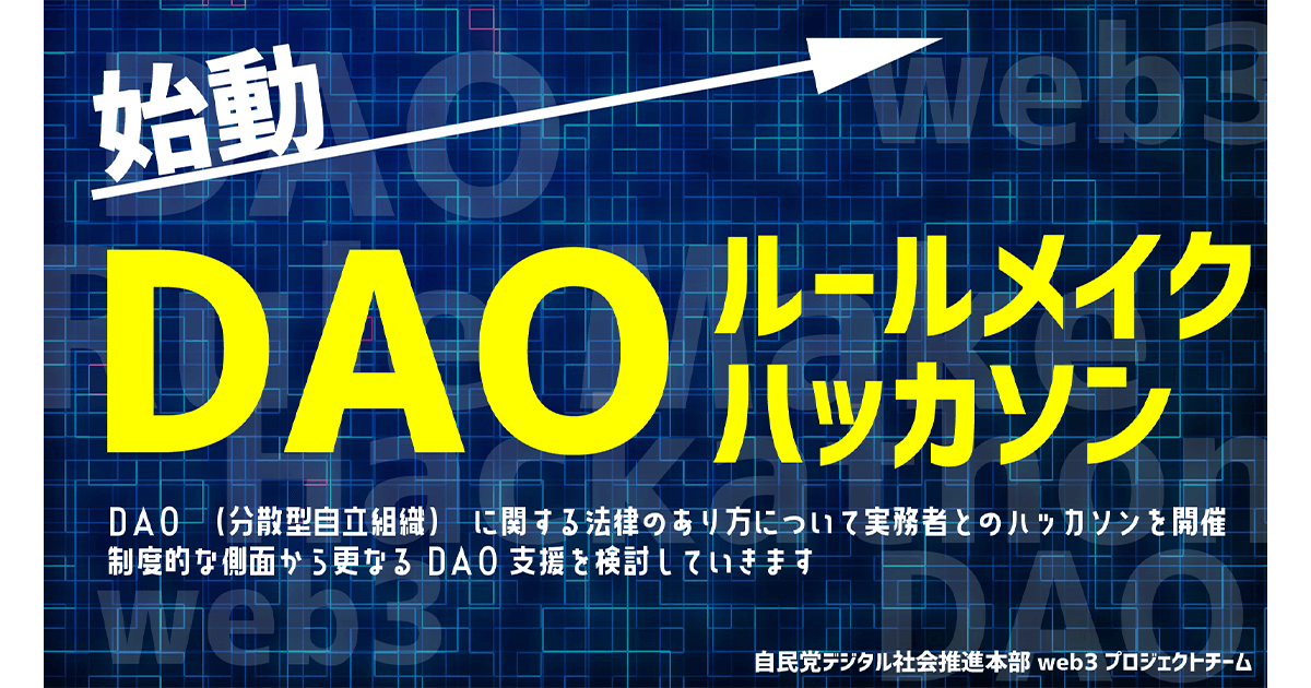 自由民主党デジタル社会推進本部Web3プロジェクトチームが15、22、29日の3日間、DAO(分散型自立組織)に関する法律の在り方の検討を目的に、DAOルールメイクハッカソンを開催する。