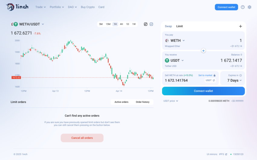 Advancedモードは、経験豊富なトレーダー向けにすべての1inch機能を提供します。このモードではライブ価格チャート、トレードルート詳細表示、高度なスワップ設定が可能です。注文を複数の流動性ソースに分割する方法を確認したり、スリッページ許容値、ルート優先度などのパラメータを調整できます。