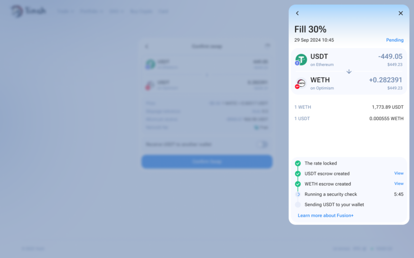 Fusion+を使用すると、1inchは安全で分散型のクロスチェーンスワップという、DeFiにおいて独自かつ実用的な機能を提供します。第三者のブリッジが不要です。