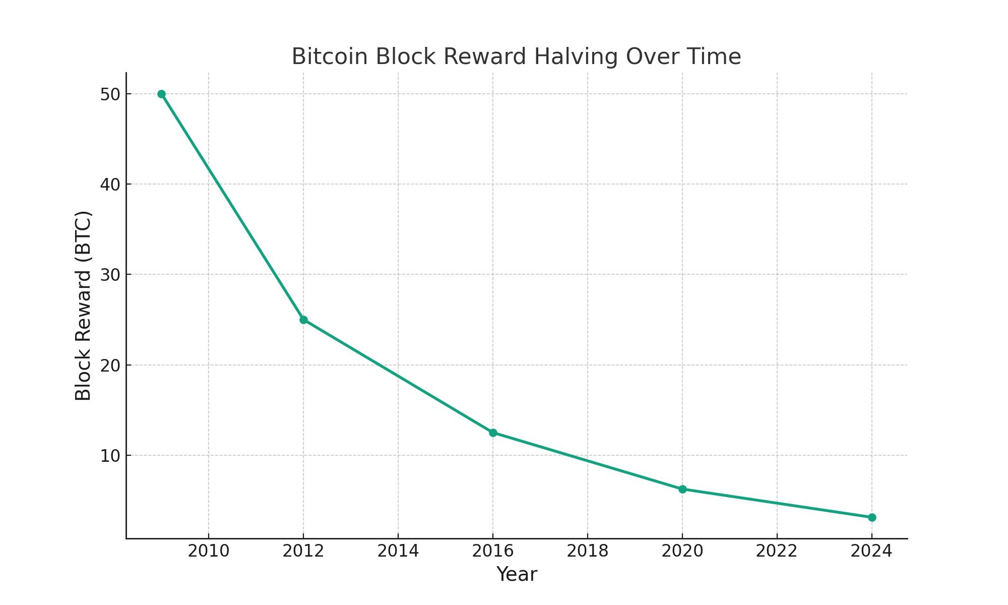 そして、下記がビットコインの半減期に関するデータチャートです。X軸は年を、Y軸はブロック報酬(BTC)を表しており、各点は半減期を表しています。