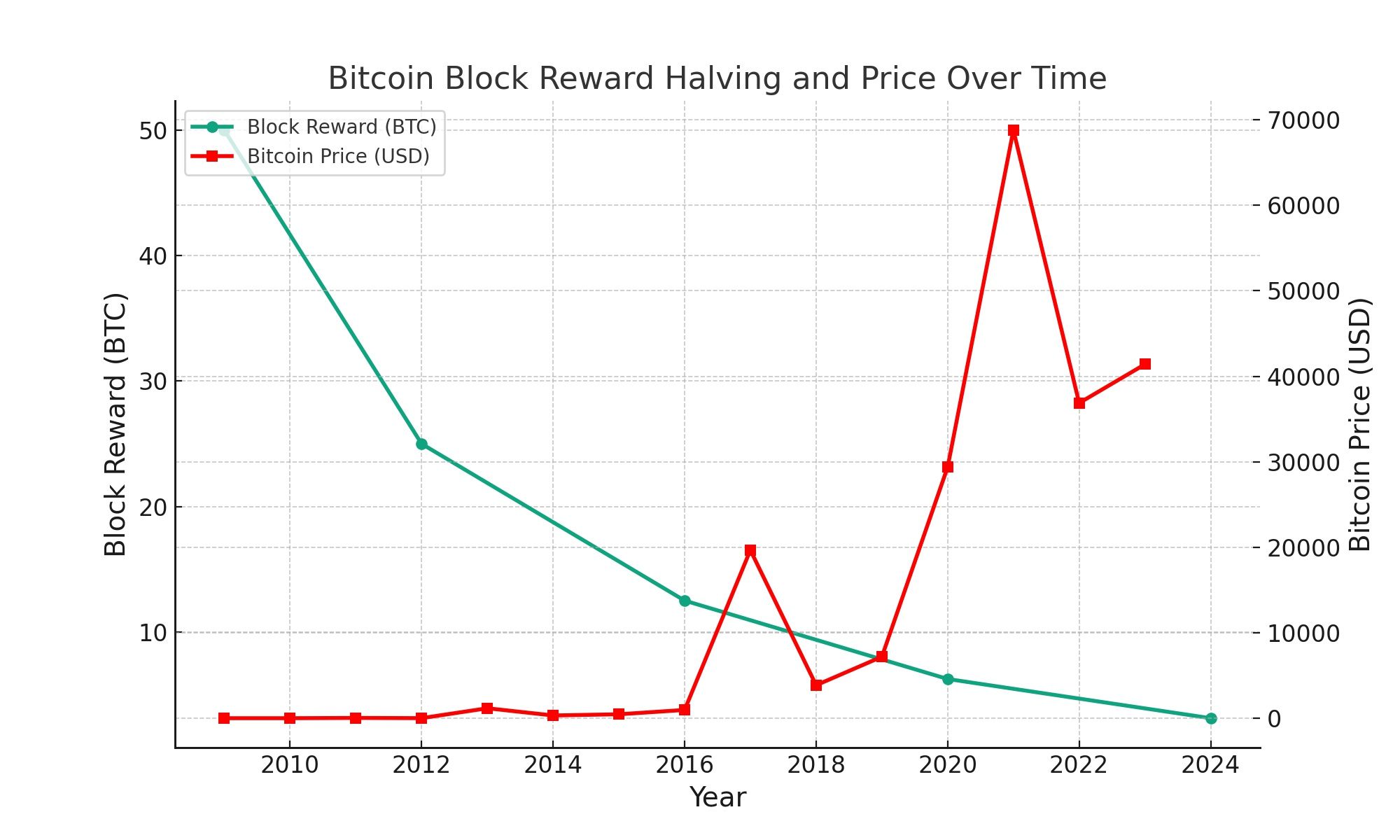 青い線がブロック報酬(BTC)、赤い線がビットコインの価格(USD)を表しています。半減期が近づくと価格が上昇する傾向が見られ、半減期が終わると価格が下降する傾向があることがグラフからわかります。