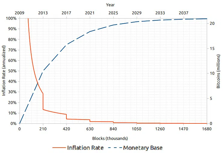 ビットコインの供給量は、2100万BTCに上限が定められています。また、ビットコインの年間採掘量は、半減期と呼ばれるイベントによって、約4年ごとに半減していくため、ストックフロー比率は、時間とともに上昇していきます。