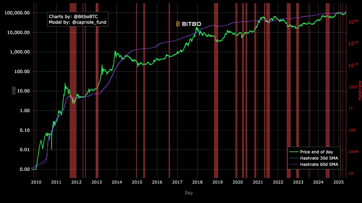 ハッシュレートの30日平均が60日平均を下回ると、マイナー撤退の兆候となり、価格下落圧力が高まります。