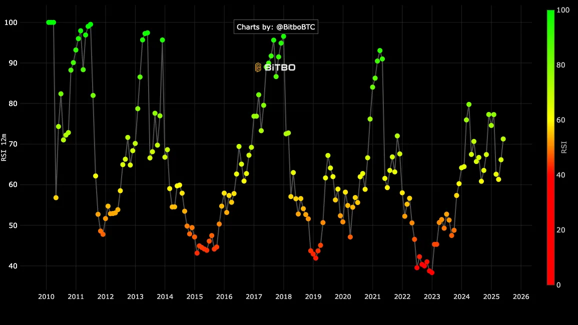2021年11月、ビットコインが史上最高値をつけた際、RSIは70台後半でした。その後、価格は大幅に下落しました。
