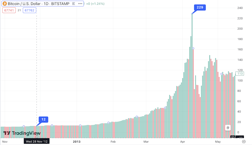2012年11月28日、ビットコインは初めて半減期を迎え、ブロック報酬が50BTCから25BTCに減少。価格は半減期直前で1BTC=約12ドルとごく小規模な市場でしたが、その後1年間で約80倍(ピーク時$1,000超)まで急騰しました。