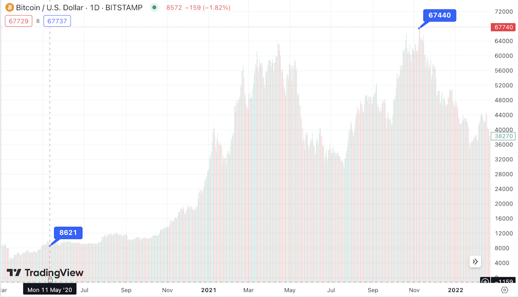 しかし、約半年後の2020年末から強力なブル相場が到来。2021年4月に$60,000を突破し、同年11月には過去最高値の$69,000を記録。半減期前から約8倍の上昇でした。
