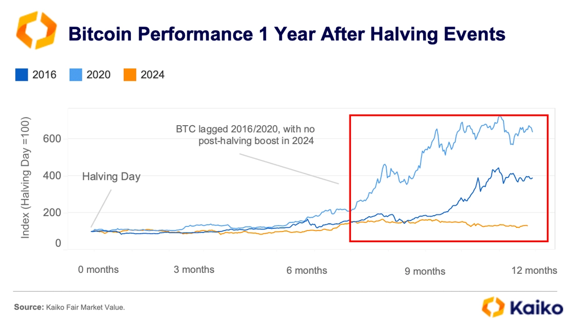結論から言えば2024年の半減期後、ビットコイン市場では「4年周期サイクル」がこれまでほど単純ではなくなりつつあります。リサーチ機関のKaikoによると、特に「半減期から9か月後」に見られるはずの急騰が今回に限って欠如しています。これは「いつものビットコインサイクル」における典型的な動きが今回は発生しなかったことを意味しています。