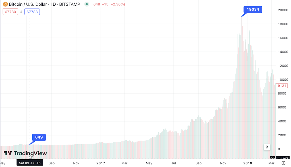 | 2024年3月 | 過去最高値$73,800を記録 |