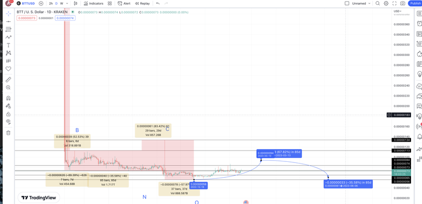 次の安値は、最低高値から最低底値の%を使用して、2023年6月に$0.00000061に浮上します。また、BitTorrentの成長の可能性を念頭に置いて、最小の下落率を採用しました。