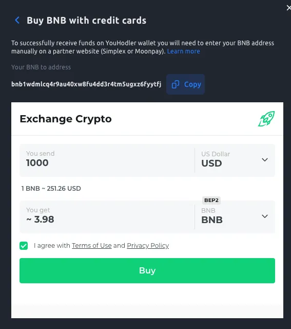 YouHodlerで「暗号資産を購入」をクリックすると、BNB購入のためのオプションが表示されます。