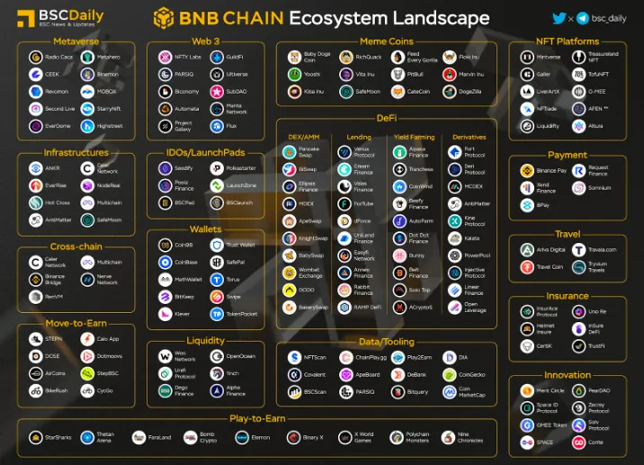 多くの代替L1とは異なり、BNBは活気に満ちたエコシステムを持ち、分散型取引所、イールドファーミング、NFTなど、様々なDAppsが活躍しています。以下、BNBチェーン上のDAppsのほんの一例をご紹介します。