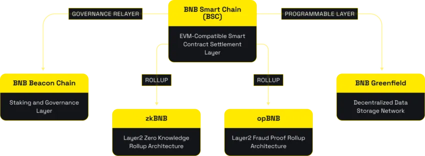 BNBチェーンの統合後、BNBチェーンはビーコンチェーンとして機能し、BSC(BNBスマートチェーン)と並行して稼働する一方で、ガバナンスやコンセンサス層としての役割も担うようになりました。BSCはスマートコントラクトや実行層となります。