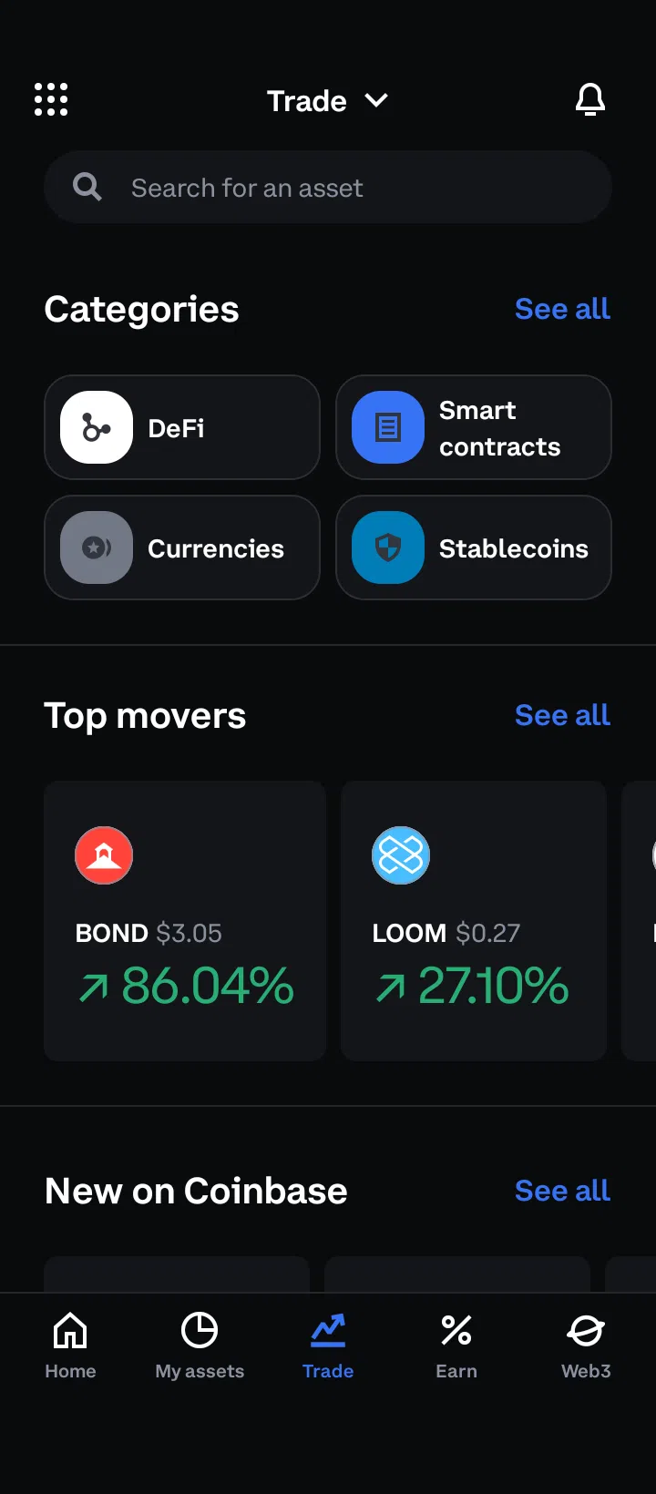 手順1:Coinbaseアプリを開き、取引タブに移動する