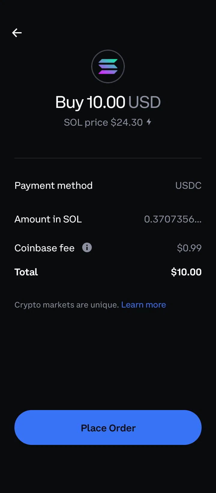 Coinbaseの公式ウェブサイトまたはアプリを開きます。画面上部の検索ボックスに「Solana」と入力して、Solana の取引ペアを表示します。