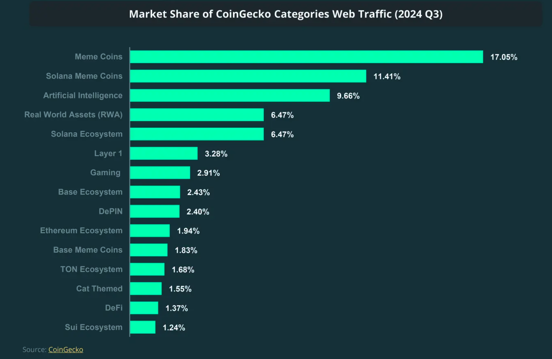 コインゲッコーの24年第3四半期のレポートによると、2024年Q3の暗号資産市場で、ミームコインが最も注目されたカテゴリとなり、全体のトラフィックシェアのうち17.05%を占めました。ミームコイン関連カテゴリ全体のシェアは31.8%に達し、投資家の間で強い関心を集め続けています。特にソラナエコシステム内のミームコインも人気を集め、個別で11.41%のシェアを持つなど、暗号資産市場で存在感を発揮しています。