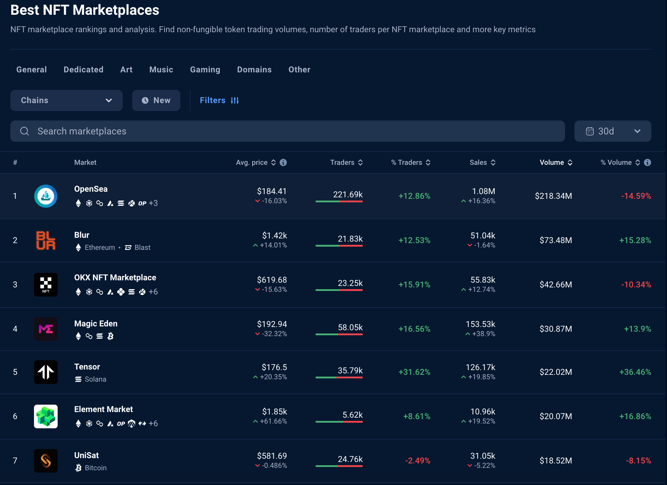 DappRaderによると24年11月時点で、OpenSeaはNFT取引量とセールス数でトップを維持しており、過去30日間だけで100万点以上のNFTが売却され、取引量は2億1834万ドルに達しています。
