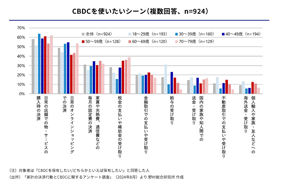 野村総合研究所のリサーチによれば、CBDCに求める機能は世代によって異なり、若年層は無料配布やポイントなどの経済的メリット、高齢者層は使いやすさと店舗での汎用性を重視する傾向があります。