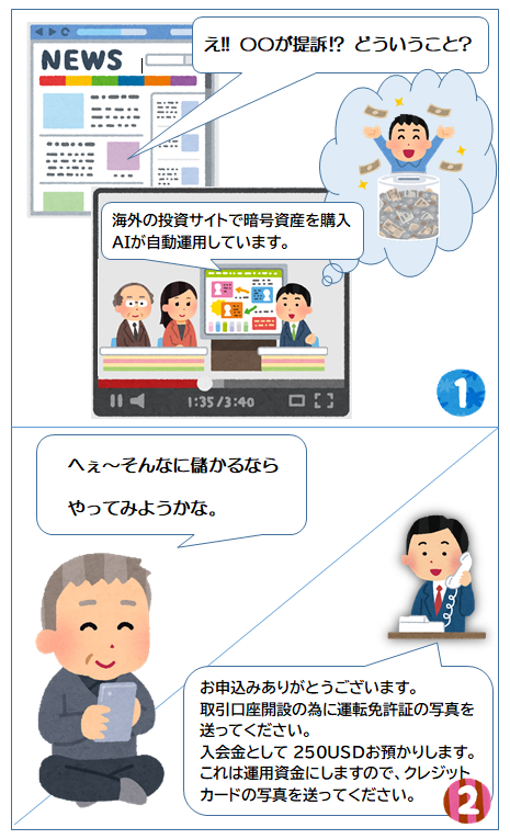 - SNS型投資詐欺 「必勝法を教える」「芸能人が推奨」などのDMや広告から、海外の怪しい投資サイトへ誘導。