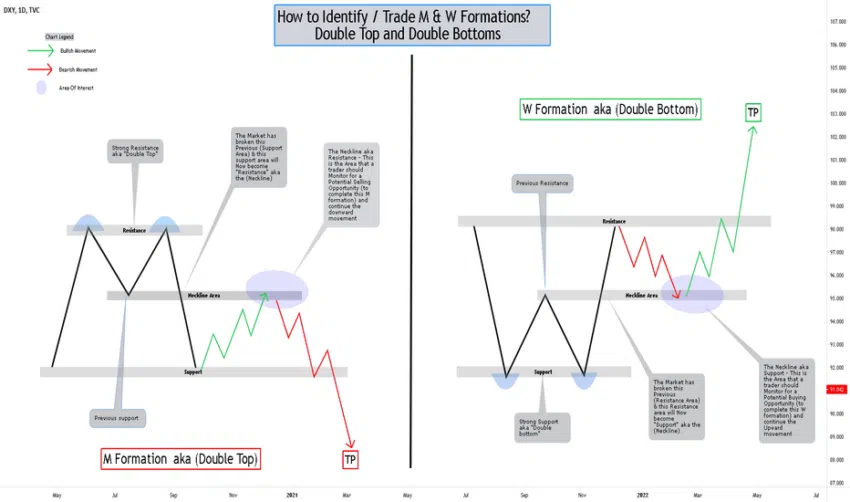 ダブルボトム(上図右)は、Wの字に似ています。これは、価格が支持線を突破できず、さらに再び失敗したエリアを指します。トレンドが反転する場合に多くみられます。