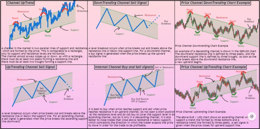 プライスチャネル(price channel)では、トレーダーは現在の相場トレンドを監視し、売買タイミングのシグナルを見つけられます。プライスチャネルは、高値と安値を2本の平行な上昇線、下降線、または水平線で結んで作られます。平行線は、抵抗(上値)と支持(下値)エリアにあります。