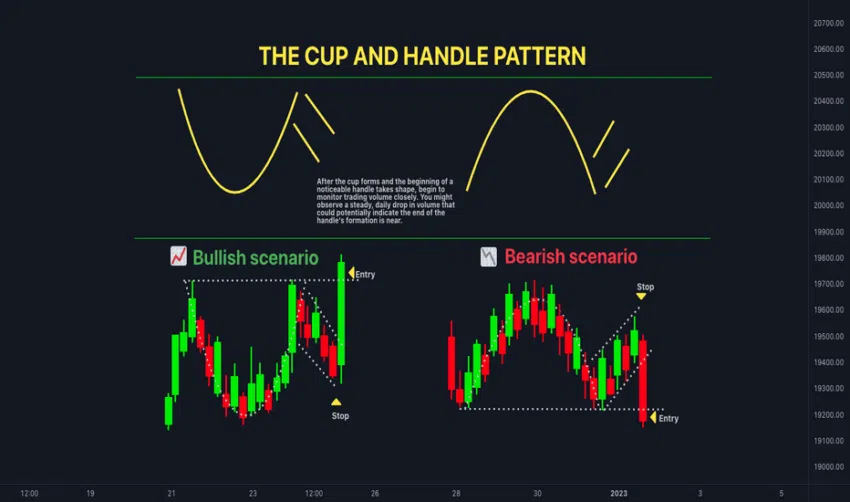 上昇相場(上図左)では、カップパターンは “U “字型になります。ハンドルがカップの右側で短い引き戻しとして現れます。ハンドルが終了すると、価格は高値を更新し、上昇トレンドに移行するとみられます。