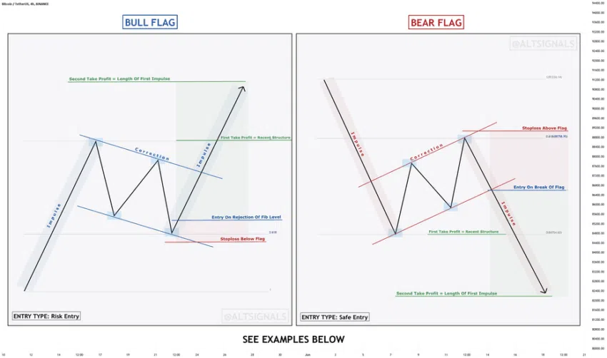 上向きに傾いているフラッグ(旗)は、下降トレンド相場の休止として(ベアフラッグ)、下向きに傾くフラッグは、上昇トレンド相場の中断として現れます(ブルフラッグ)。
