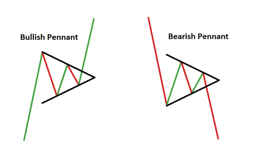強気のペナントは、価格が上昇していることを示し、フラッグポール(旗竿)はペナントの左側に現れます。弱気のペナントは、価格が下落していることを示し、ペナントの右側にフラッグポールが形成されます。