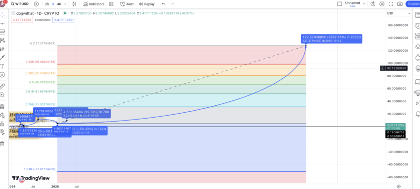 2025年の低値および高値をもとにフィボナッチリトレースメントを利用し、2030年までの予測を行うと、WIFの価格が127ドルに到達する可能性があると考えられます。ただし、WIFは比較的新しいトークンであり、これらの数字を十分に裏付けるには長年の取引履歴が必要です。