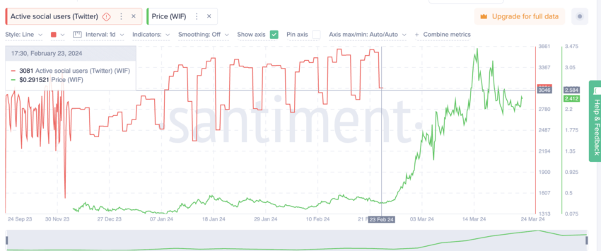 ミームコインはコミュニティやソーシャル・センチメントに依存しています。WIFの場合、2024年2月中にユーザー数が着実に増加し、その後の急上昇につながりました。