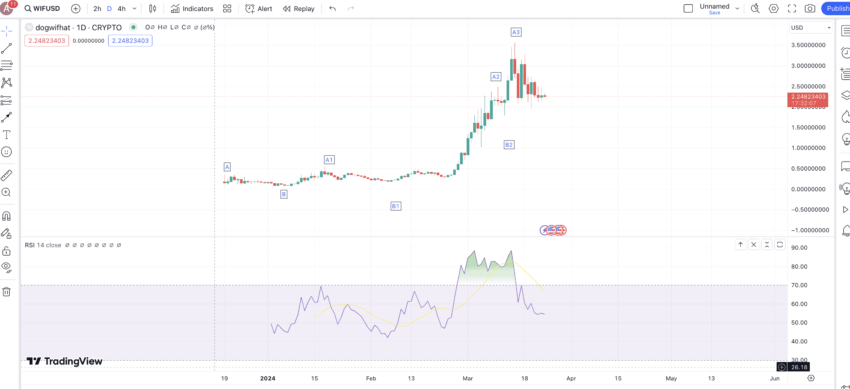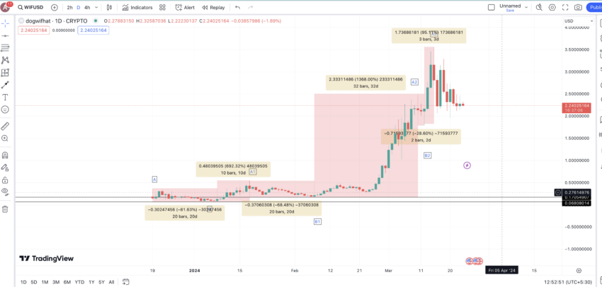 長期的な価格予測に入る前に、短期的なWIFの可能性について詳しく見ていきましょう。特に、すでに2024年第1四半期に強気相場が見られる中で、WIFは急速に22億ドル以上の大規模な時価総額を達成しており、価格動向とそれに伴うテクニカル分析を検討する理由となっています。