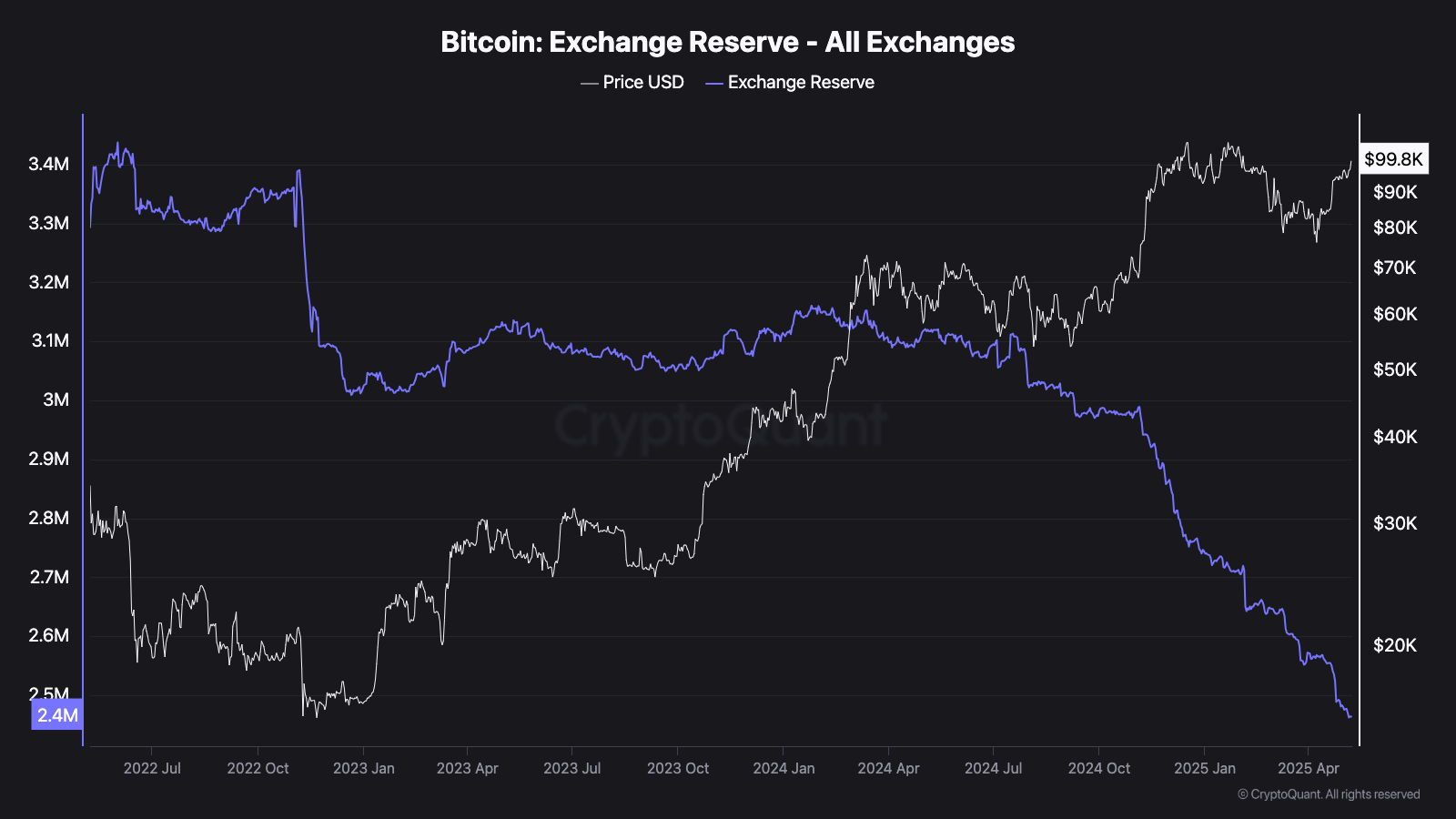 また、取引所からのBTC引き出しが継続し、2025年初には取引所保有残高が1年以上ぶりの低水準に減少しています。これはBTCの売り圧力が減少し、価格上昇要因になり得ることを示しています。