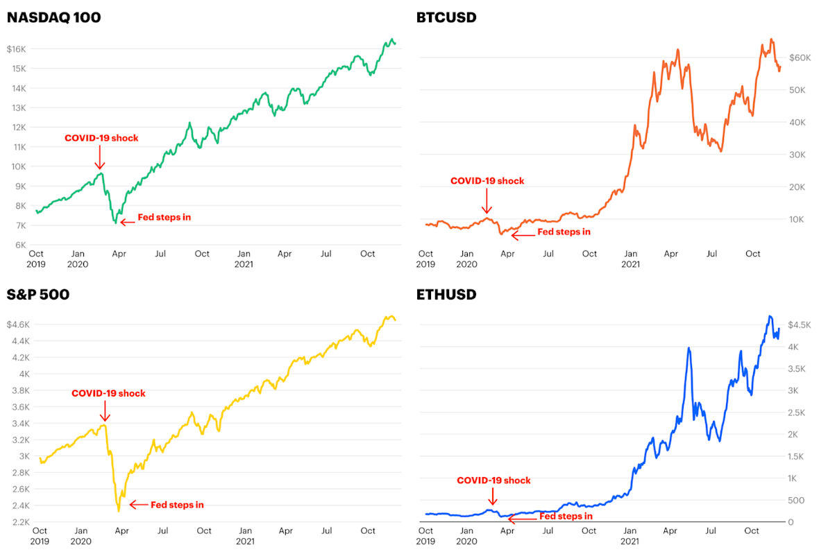 ビットコインとイーサリアムは2021年11月初旬にピークを打ち、FRBが実際に利上げを開始する数週間前に下落に転じました。このことは、市場がFRBの動きを予測して先回りする傾向があることを示しています。