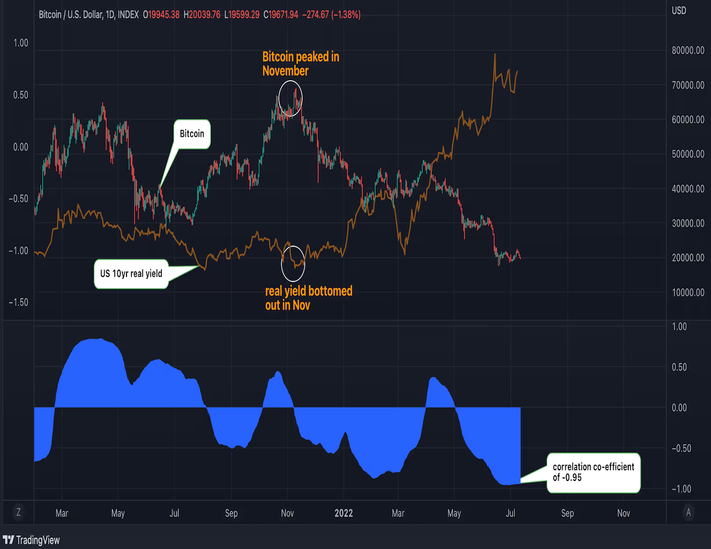 BTCと実質金利の相関(2022年中盤)