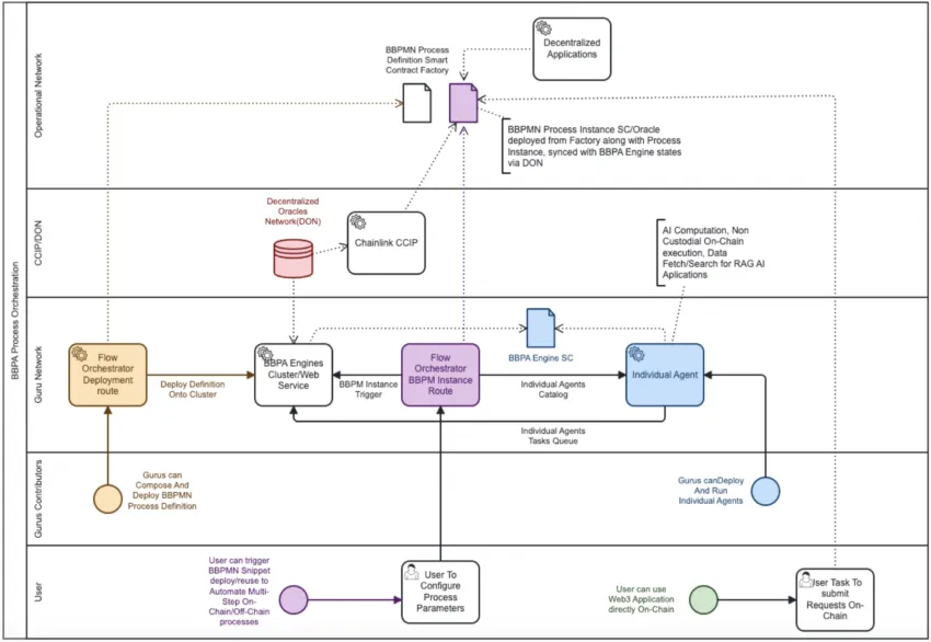 ネットワークの至宝はFlow Orchestratorです。これは、BPMNと呼ばれる特別な言語を使って複雑なプロセスをマッピングする強力なエコシステムコンポーネントです。オンラインでもブロックチェーン自体でもデプロイできます。