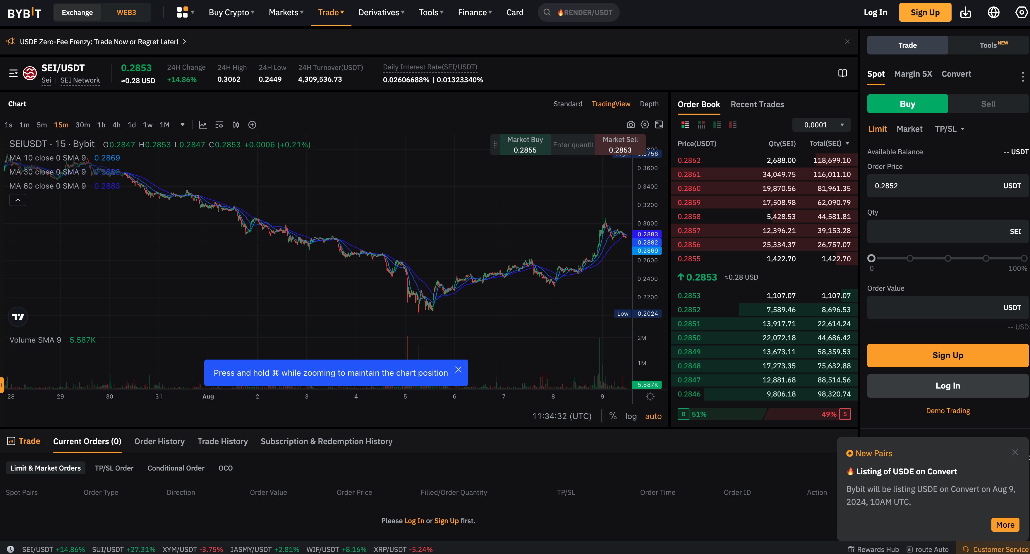 - 成行注文でUSDTを使ってSEIを購入します。