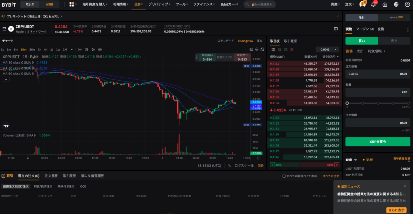 - 海外取引所の現物取引画面で「XRP/USDT」のペアを選択