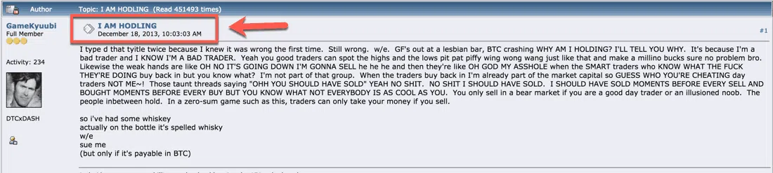 暗号資産業界ではこれ(長期保有)をホドリング(hodling)と呼びますが、これは、かつて暗号資産の長期保有を推奨した人が酔っぱらって「holding」と誤記してしまったことに由来します。実際、ホドリングはビットコインの初期投資家にとっては極めて有益であることが証明されており、自身が保有するビットコインがたった数セントから2万ドルに上昇した相場を体験しているのです。