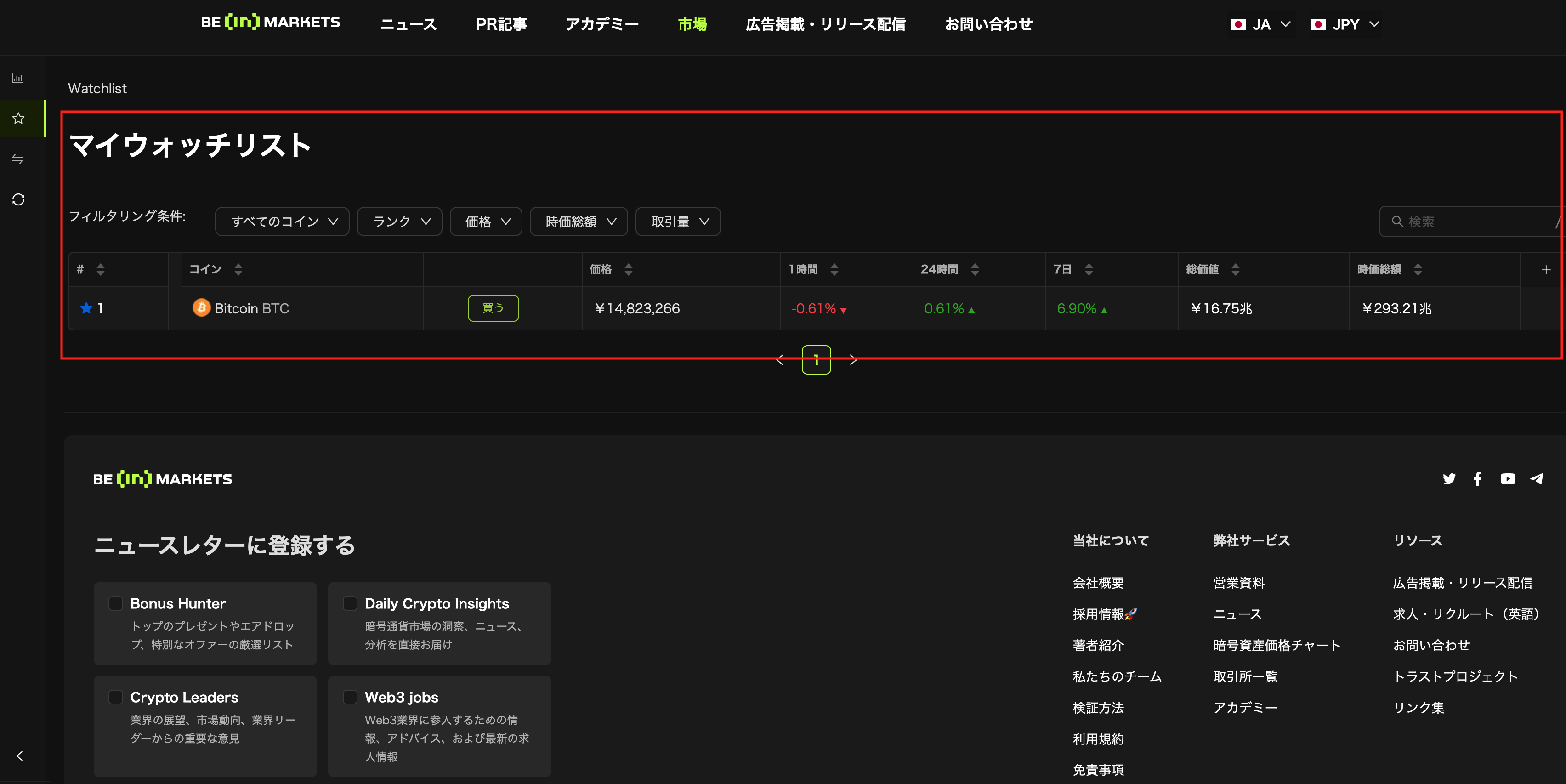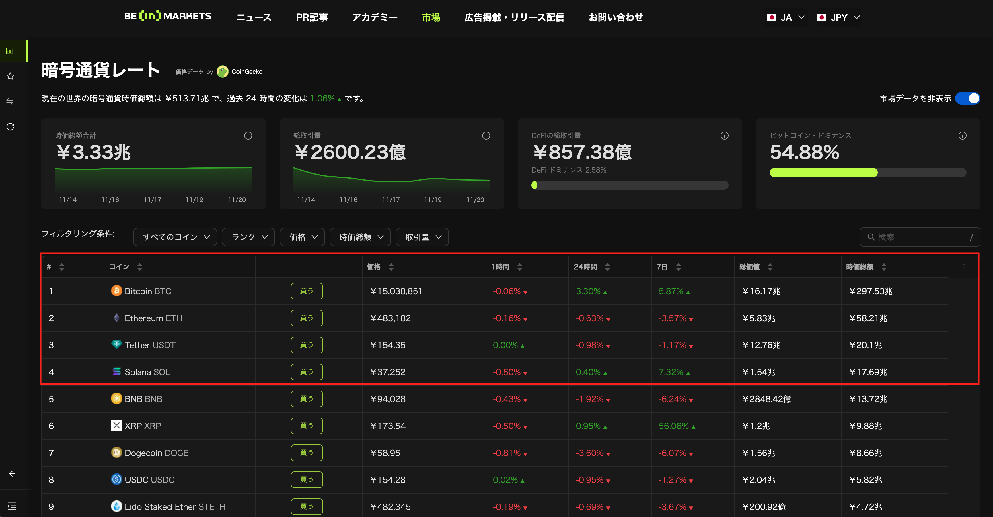 BeInMarketsでは、暗号資産をさまざまな条件でフィルタリングし、ランキングを表示できます。この機能により、特定の暗号資産や市場動向に関する分析が簡単に行えます。