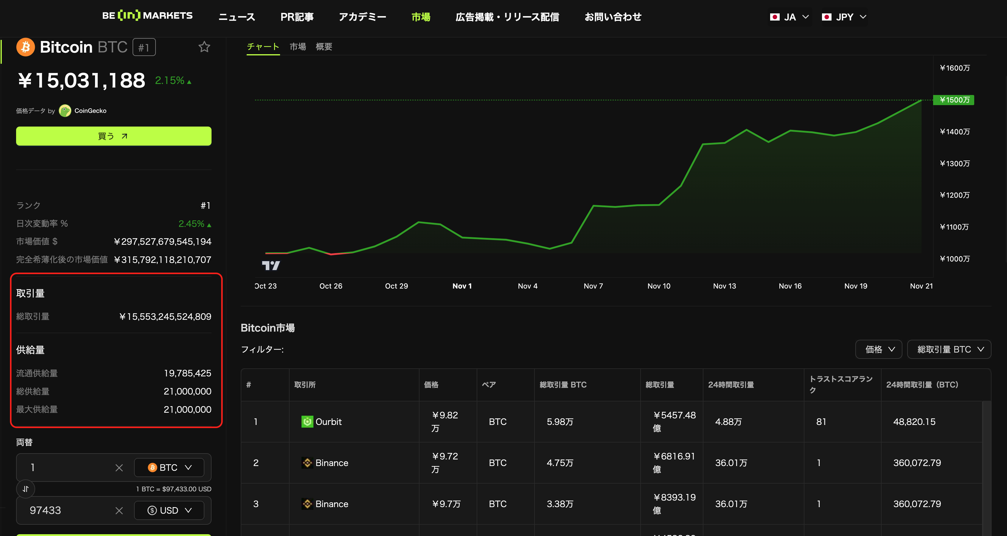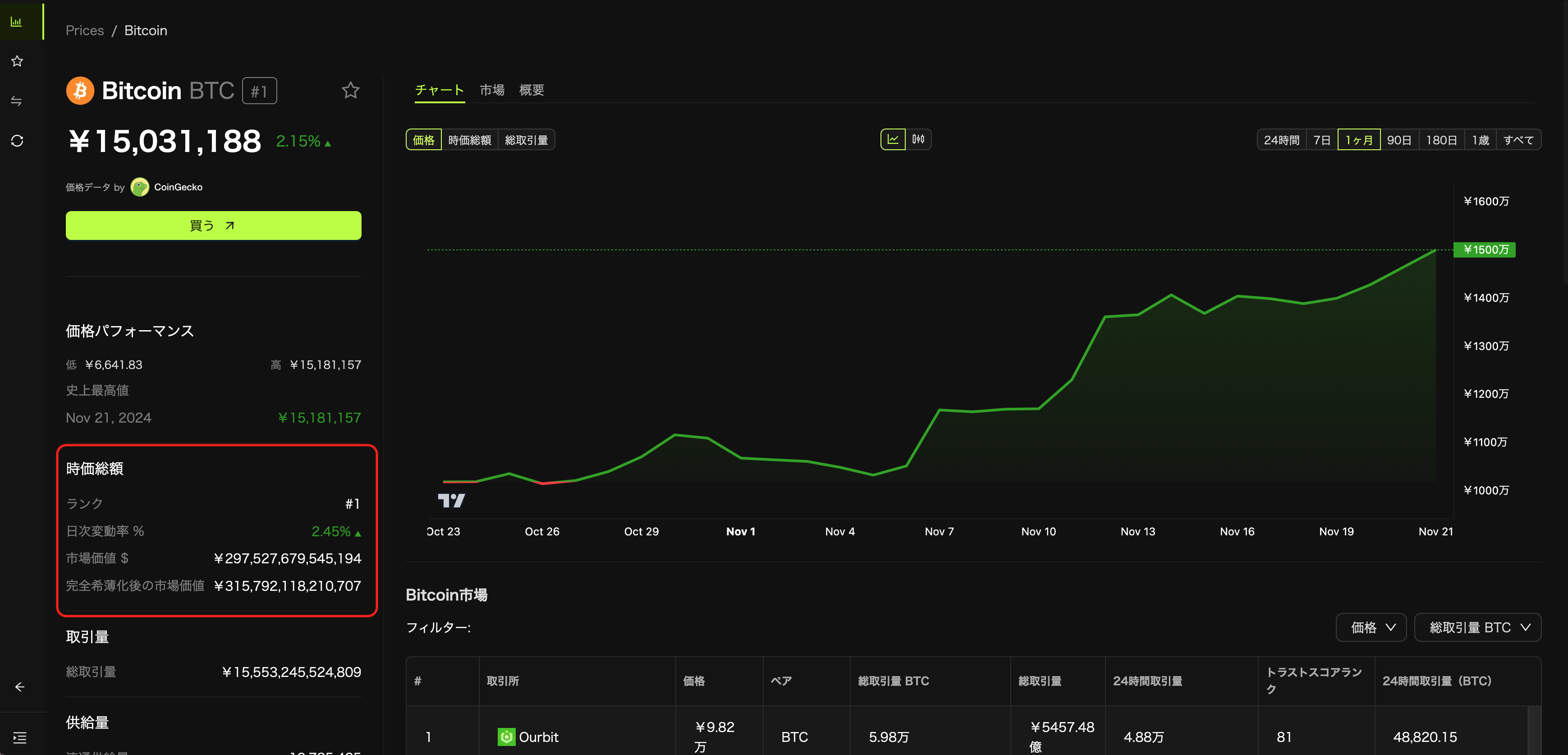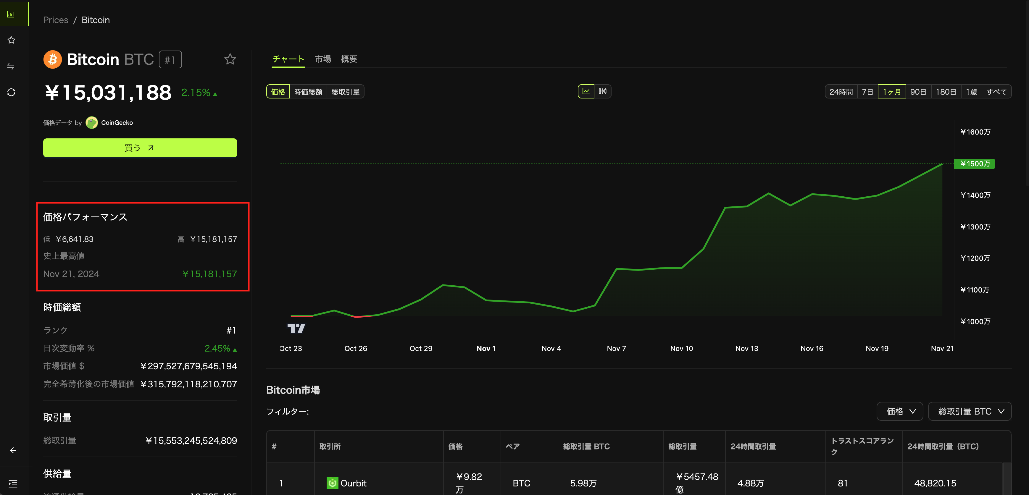 また、「史上最高値」として示される¥15,181,157は、2024年11月21日時点での過去最高の価格を記録しており、ビットコインがどのように成長しているかを理解する助けになります。このデータを元に、現在の価格が過去の最高値にどの程度近いか、あるいはそれを超える可能性があるかを検討することができます。