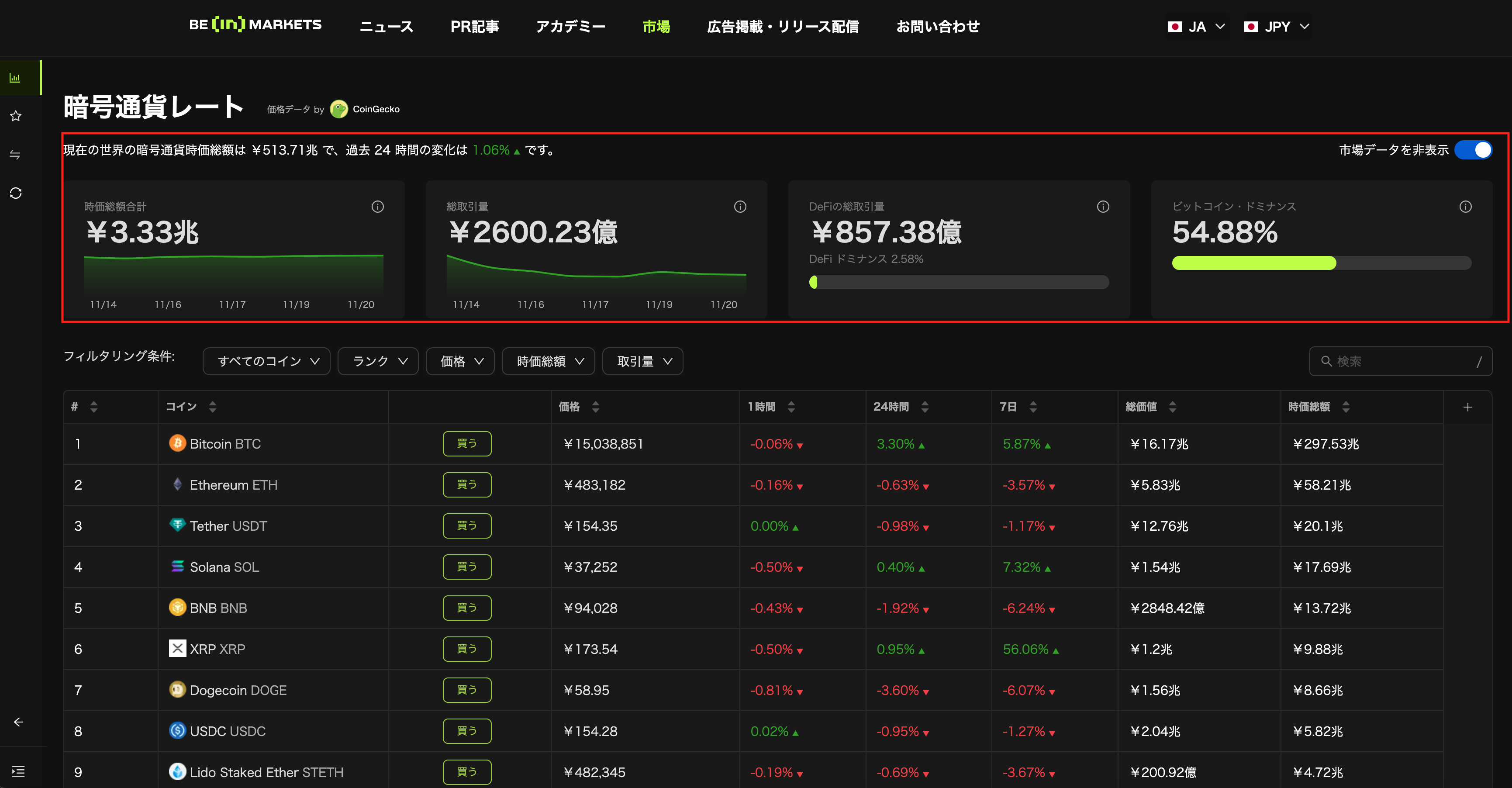 BeInMarketsは、暗号資産の価格やその他のデータがリアルタイムで更新されます。これにより、常に最新の市場情報に基づいて投資判断を行うことが可能です。