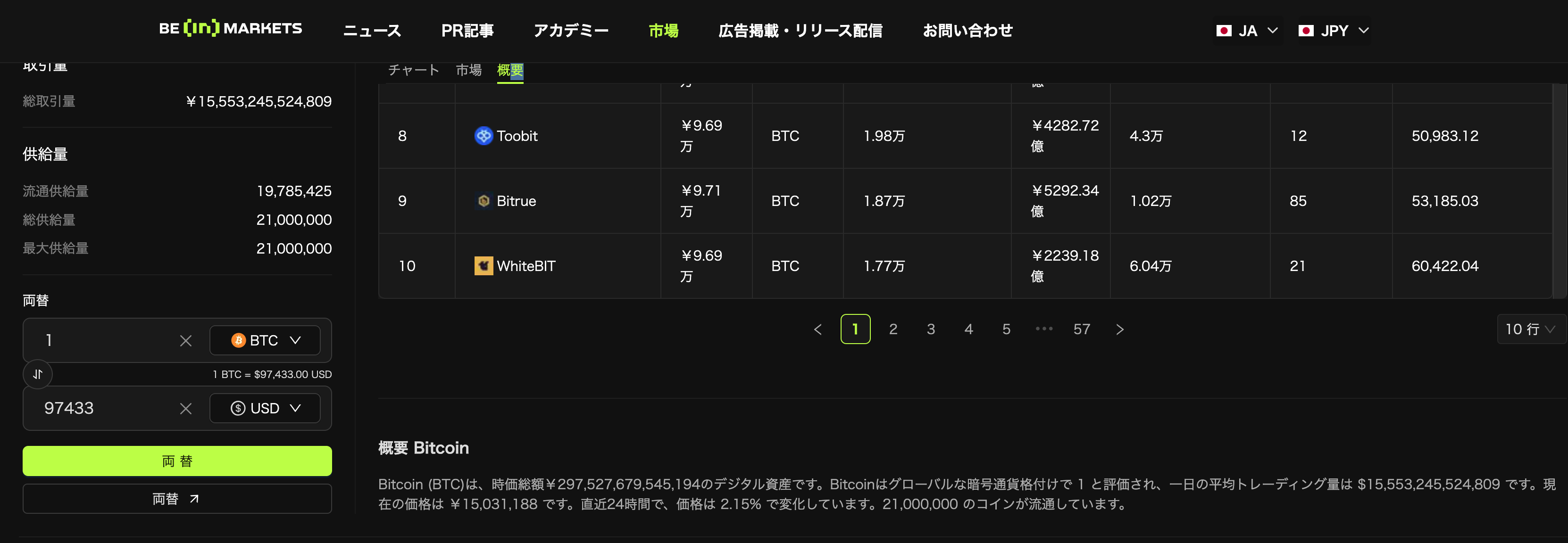 ページの下部には、ビットコインが取引されている取引所ごとのデータが表示されています。チャートの文字の右にある市場をクリックすることで同セクションに移動もできます。ここでは、取引所名、ビットコインの価格、取引ペア(例えばBTC/USDやBTC/JPYなど)、総取引量、24時間取引量、トラストスコア(信頼性を示す指標)がリスト形式で確認できます。
