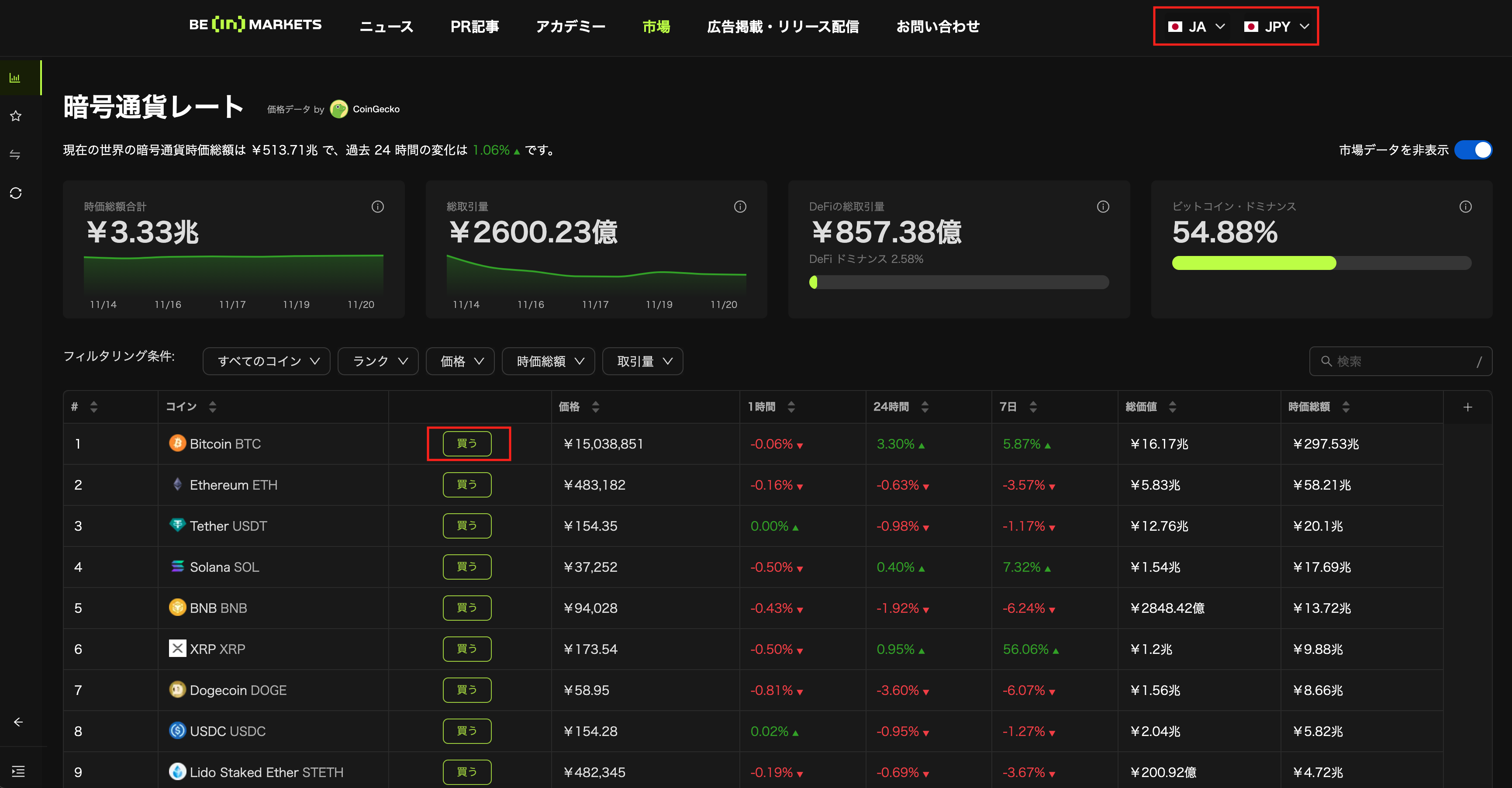 各暗号資産(例えば、ビットコイン、イーサリアム、ソラナなど)の現在の価格が表示されます。価格は日本円(JPY)で表示されていますが、右上のJPYと表示されている場所をクリックすることでお好みの通貨に変更できます。