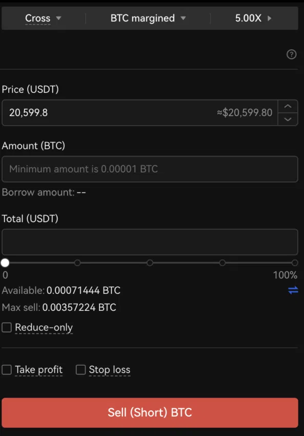 ステップ4:完了したら、取引ダッシュボードに戻り、クロスパネルの下にある「Sell (Short) BTC」(暗号資産(仮想通貨)を空売りする)オプションを選択します。(直近で振り込まれた)利用可能な資金を残らず借りるか、あるいは、エクスポージャーを最小限に抑えるためのレバレッジ額を選択できます。