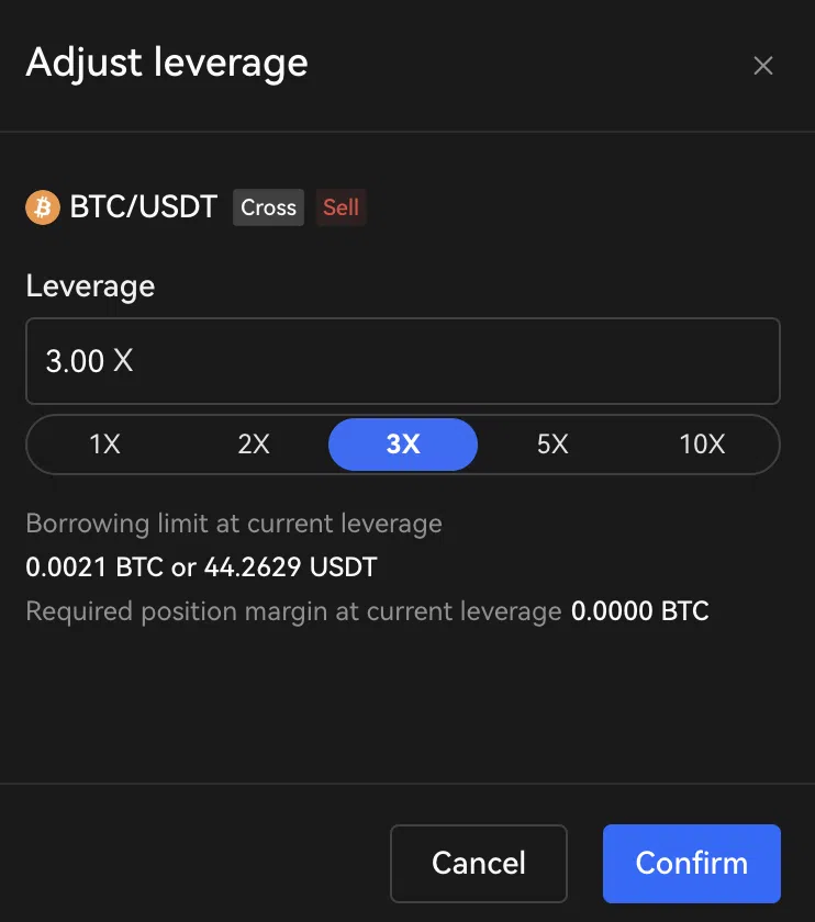 OKXはデフォルトで5倍のレバレッジを用意していますが、これは一部の利用者にとってはリスクを伴います。5倍の表示パネルをクリックして、レバレッジの調整をお勧めします。ここでは、リスクエクスポージャーを下げるために3倍に変更します。担保に対して借りられる正確な資金量が確認できます。