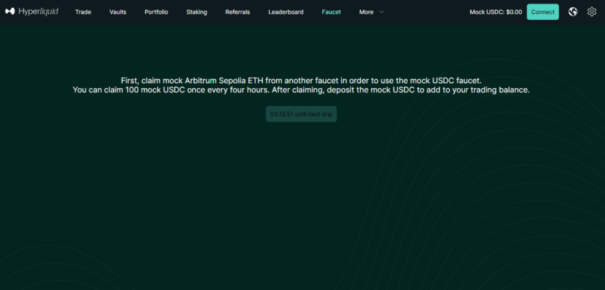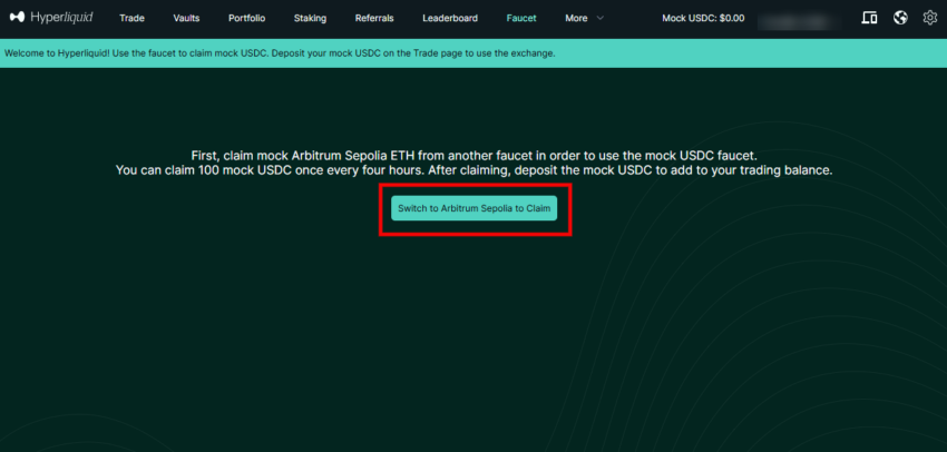 資金をリスクにさらさずに取引を試したい場合、ハイパーリキッドのテストネットを利用できます。本番環境との違いは、Arbitrum Sepoliaテストネットを使用する点です。